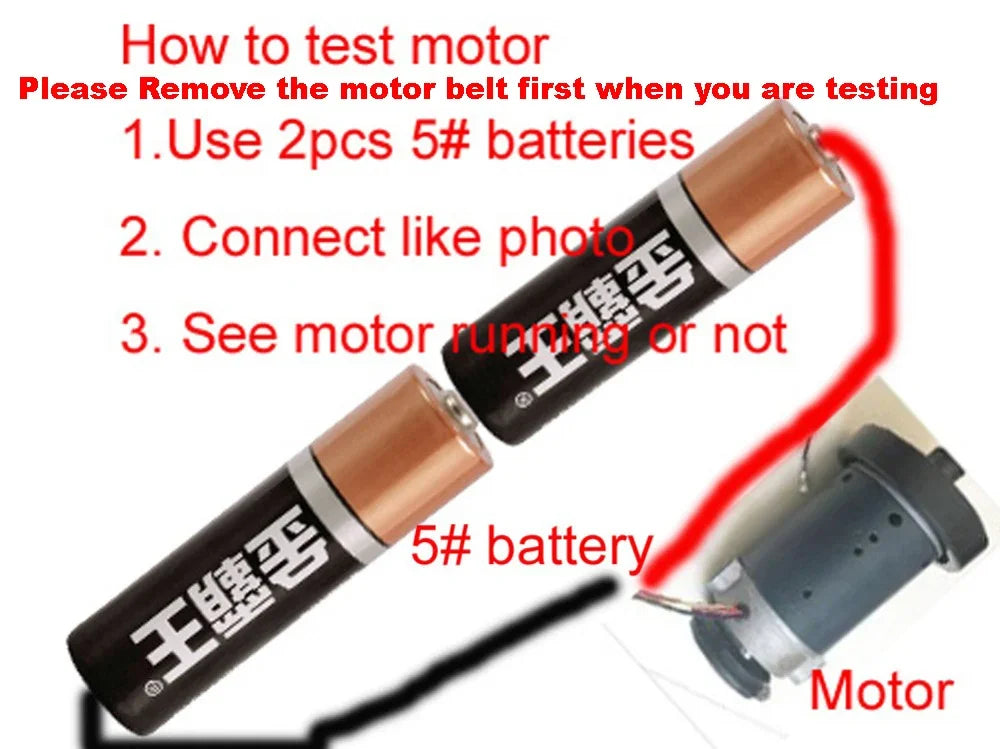 Please make sure that there is no problem with the motor before you place your order.The motor can be tested by the method shown in the picture below.If the motor running smoothly by 5# battery, that means the motor is good. If running not smoothly or do not running, it means the motor broken.